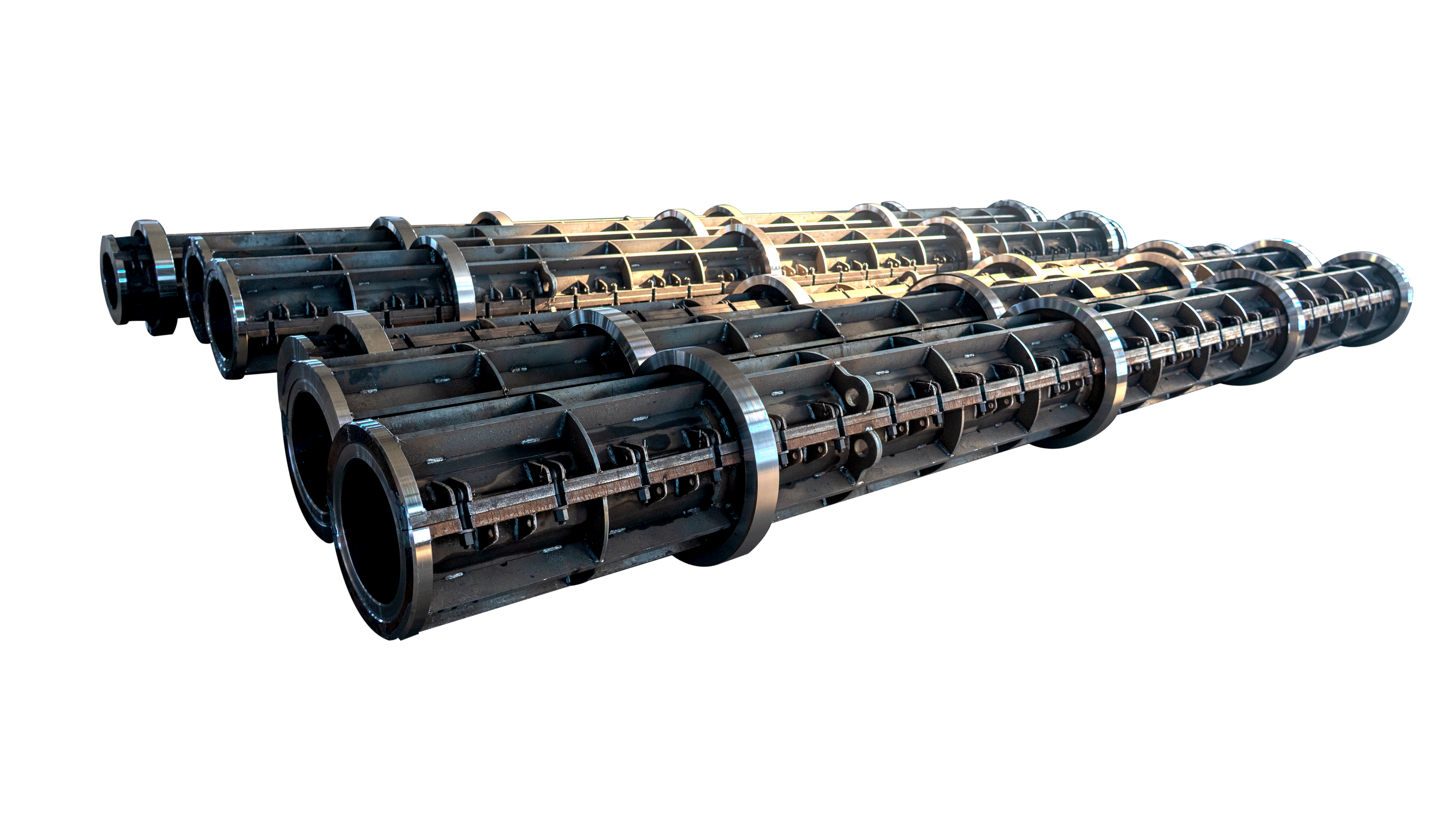 管桩模具为分段式桩模,整体组装,结构坚固,抗拉力强度大,可实现一模多用,采用加厚端板、法兰,连接稳固,张拉力强,整体纵筋,稳固性好,管体不易变形,整体式吊环,安全可靠,加厚跑轮,提高了产品质量,延长了使用寿命。